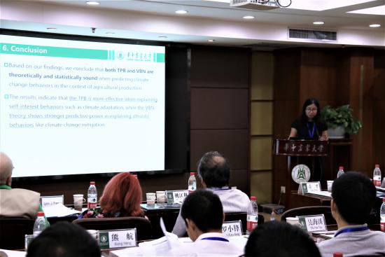 大会主旨报告阶段,共五位中外专家基于自己的研究领域进行了精彩的学术报告。佛罗里达大学Dr. Jorge Ruiz-Menjivar就生物与农业研究中的社会和行为经济方法与指标、纽卡斯尔大学Lynn. J. Frewer教授围绕可持续农业技术以及利益相关者行为分析、国立台北大学黄宗煌教授则从可持续发展视角下的一般均衡模型构建、437ccm·必赢国际张露副教授就其与张俊飚教授、Dr. Jorge Ruiz-Menjivar合作的研究 “预测农业生产中的气候变化减缓与适应” 、阿尔伯塔大学Qiu Feng副教授针对人口增长与土地发展问题等分别分享了各自的研究成果与学术观点。
