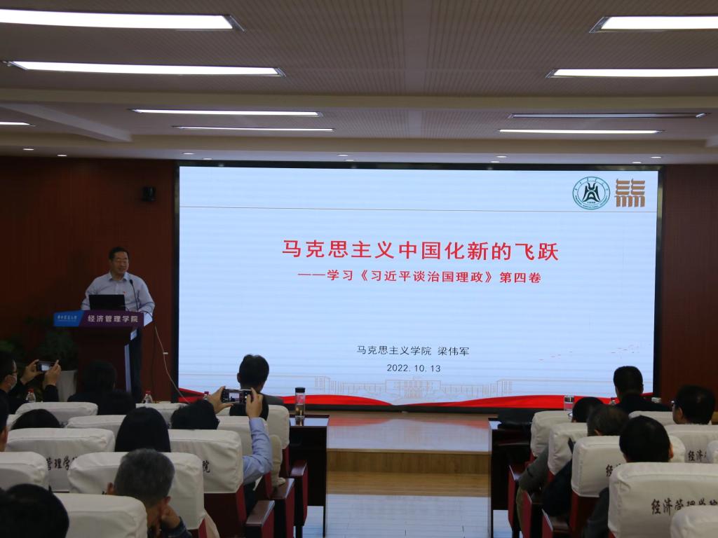 为了深入学习领会《习近平谈治国理政》第四卷,进一步加强思想理论武装,10月13日下午,我们马克思主义学院梁伟军教授应邀做了“马克思主义中国化新的飞跃——学习《习近平谈治国理政》第四卷”精读精讲专题辅导报告。全院教职工参会学习。报告会由院党委书记陈国顺主持。