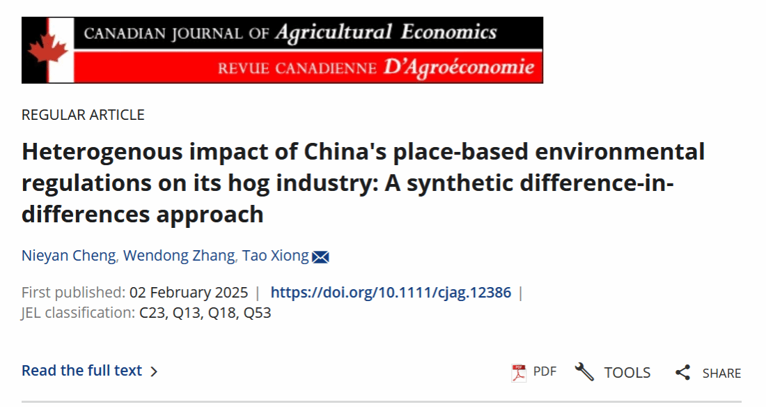 近日,我们熊涛教授与合作者的研究论文 “Heterogenous impact of China’s place‐based environmental regulations on its hog industry: A synthetic difference‐in‐differences approach”在国际农业经济管理领域重要期刊Canadian Journal of Agricultural Economics发表。该研究运用新颖的合成双重差分法,研究旨在保护南方水网地区水质的生猪产业环境规制的政策效应,为明晰环境规制政策的异质性效应提供了实证依据。