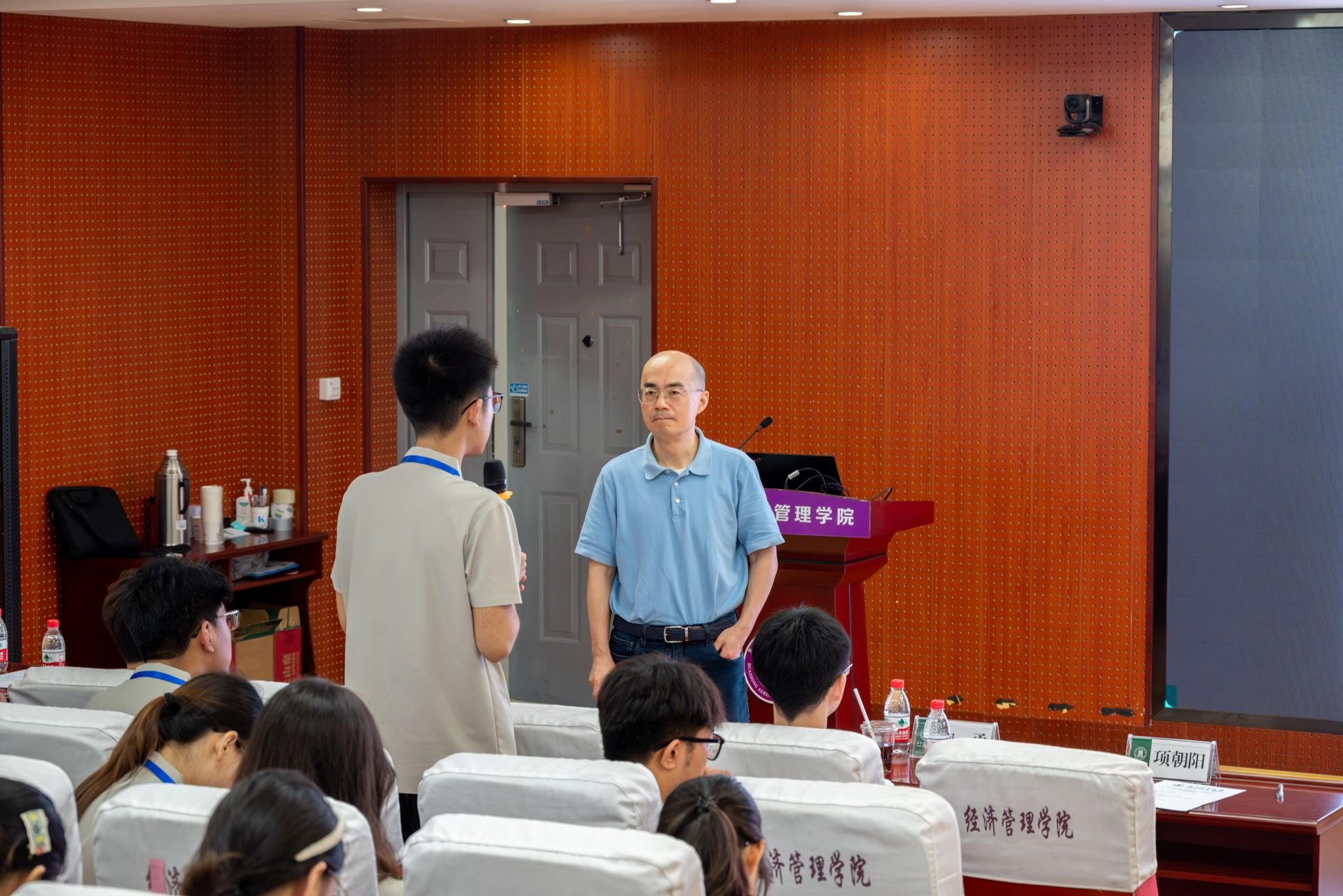 最后,由普渡大学鲍勇教授带来题为“二元动态面板数据估计方法前沿进展”的专题报告。鲍勇深入浅出地阐释了二元动态面板数据的建模挑战,特别是在处理变量内生性和复杂固定效应时的难点。他重点介绍了其研究团队提出的创新性估计方法并与同学们进行了深入探讨。