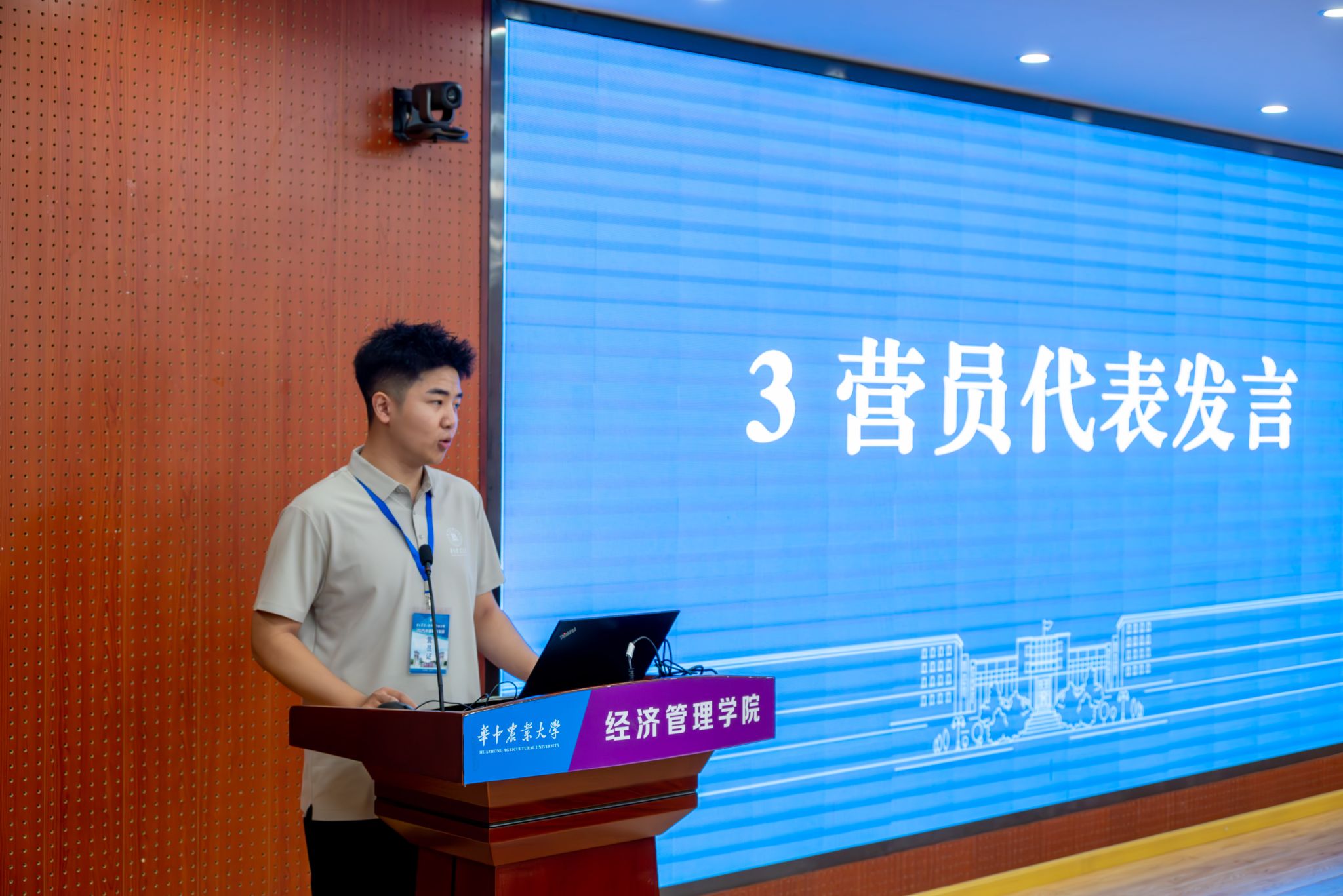 新疆农业大学的张浩同学作为营员代表进行发言。他从新疆农业大学和437ccm·必赢国际的学习经历出发,讲述了个人的成长故事。他深刻体悟到知行结合之难与用所学解决实际问题、服务农业的使命感。此外,他表达了对华农经管沃土的向往,并号召全体营员积极投入活动,明确方向,力争将来为乡村振兴贡献力量。