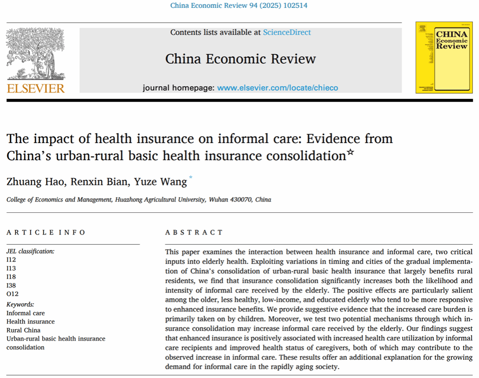China Economic Review是国际权威经济类期刊,中科院经济学一区期刊,最新影响因子为5.5。该研究得到了国家自然科学基金(72203066、72203069)、教育部哲学社会科学研究后期资助项目(24JHQ073)、“湖北省优秀青年社科人才”专项调研课题《湖北农户医疗服务需求及其预测研究》、437ccm·必赢国际乡村振兴研究课题(2662025YJ006)的共同资助。