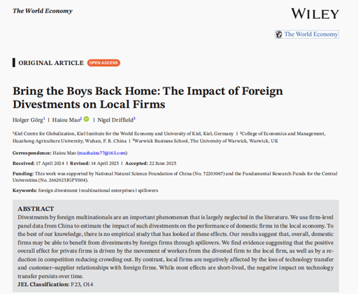引用来源:Görg H, Mao H, Driffield N. Bring the Boys Back Home: The Impact of Foreign Divestments on Local Firms[J]. The World Economy, 2025, online.
