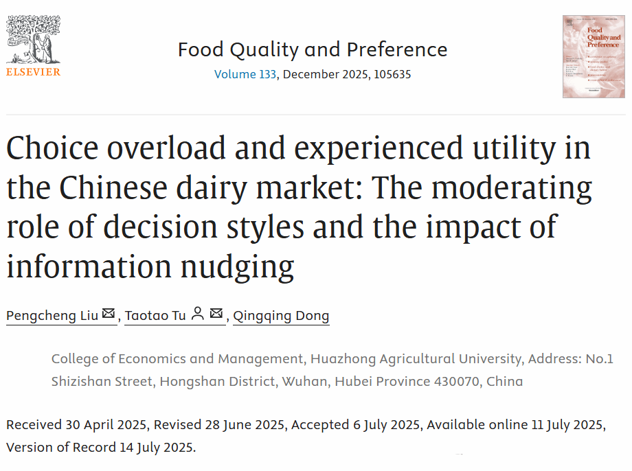 437437必赢国际网址经济学系柳鹏程老师(一作)和涂涛涛老师(通讯)团队合作论文“Choice Overload and Experienced Utility in the Chinese Dairy Market: The Moderating Role of Decision Styles and the Impact of Information Nudging”发表于Food Quality and Preference杂志。该杂志是一本以FOOD SCIENCE & TECHNOLOGY为研究方向的国际顶尖学术杂志,由Elsevier Ltd出版,为中科院一区Top期刊。