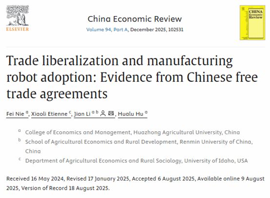 由我们聂飞副教授(第一作者)、李剑教授(通讯作者)、硕士研究生胡华璐与美国爱达荷大学 Xiaoli Etienne 合作撰写的学术论文“Trade liberalization and manufacturing robot adoption: Evidence from Chinese free trade agreements”近日发表于经济学权威期刊“China Economic Review”。“China Economic Review”(SSCI Q1,IF=5.5)是一本专注于中国经济研究的国际学术期刊,致力于发表有关中国经济发展、政策与市场等方面的高质量研究成果,在国际经济学界具有较高的学术声誉与广泛影响力。