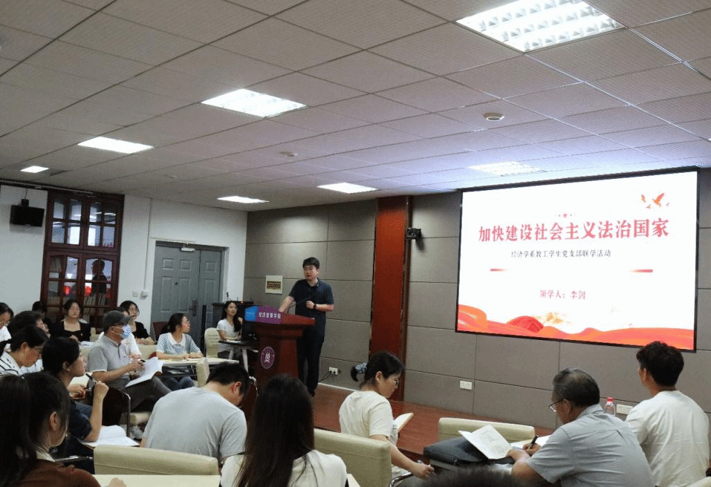 6月8日晚,师生于人文楼M412会议室共同开展理论学习,经济学系教工党支部书记李剑以“加快建设社会主义法制国家”为题讲授专题党课,带领师生党员深入学习习近平总书记《实施好民法典》《从全局和战略高度推进全面依法治国》《全面推进中国社会主义法治体系建设》等重要文章精神。李剑强调,党员教师应自觉担负起法治教育责任,认真学习《中华人民共和国民法典》,通过精选相关内容编入教案、与经济学科教学结合开展课程思政、联系学生生活实际开展专题学习等途径,将民法典相关内容融入学科教育体系。结合党中央对全面依法治国的“十一个坚持”、建设中国特色社会主义法治体系的“五大抓手”战略部署,李剑对师生党员提出了殷切期盼。他谈到,依法执教是教育工作者贯彻落实全面依法治国方略的首要任务,党员教师应严格规范自身言行,在遵守宪法和法律的基础上开展教育教学活动;党员学生须积极承担时代责任与历史使命,努力学习法学知识,养成法治思维,培育规则意识,为法治中国建设、为实现中华民族伟大复兴中国梦贡献智慧和力量。